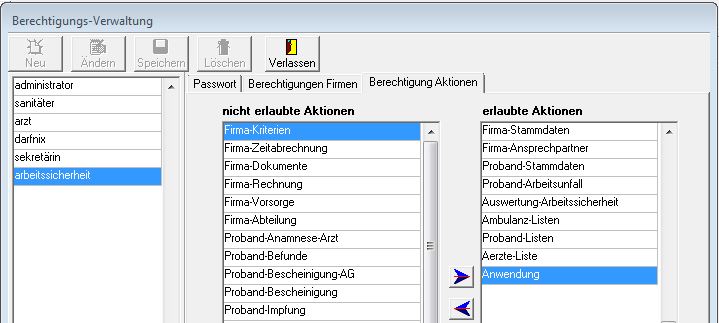 Und jetzt kommt der big Bug: Du kannst dort die Berechtigung für diese Firma auch für alle anderen Benutzer verändern, also z.B. dem administrator oder arzt die Berechtigung für diese Firma entziehen. Klar, diese können sich die Berechtigung wieder zuordnen, aber bis dahin ist die Firma erstmal "weg".