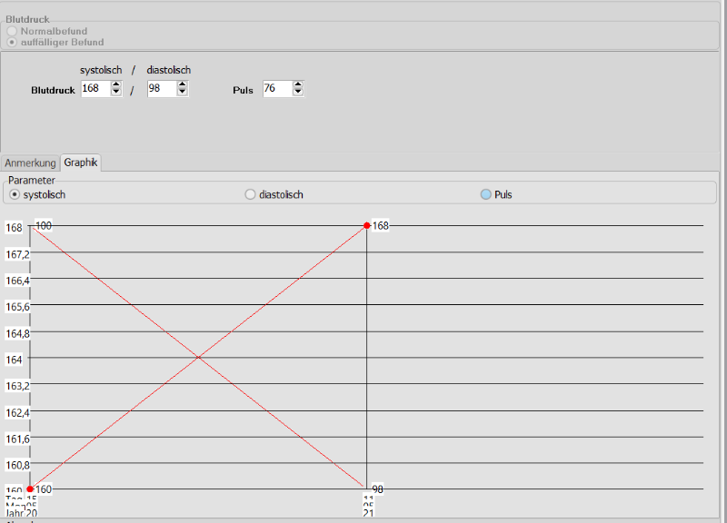 ist bei den Grafiken in der Kartei, sowohl z: B. die Kreislauf- als auch Laborparameter die Darstellung des Datum an der X-Achse fehlerhaft, insbesondere die Zahlen sind überlagert und nicht lesbar: