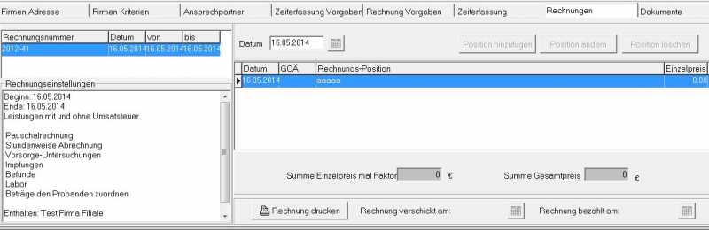 Auf den Kartenreiter Firma->Rechnungen könne Sie die firmenbezogenen Rechnungen erstellen. Ausgenommen sind nur die Leistungen, für die Sie schon eine probandenbezogene Rechnung erstellt haben.