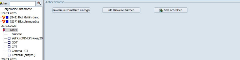Wie bekomme ich eine einfache Übersicht über die Labordaten auf den Bildschirm, ohne in den Druck bzw. Word gehen zu müssen? Wenn ich nur auf „Labor“ klicke, tauchen nur die Begriffe, wie Laborhinweise oder Brief schreiben auf.