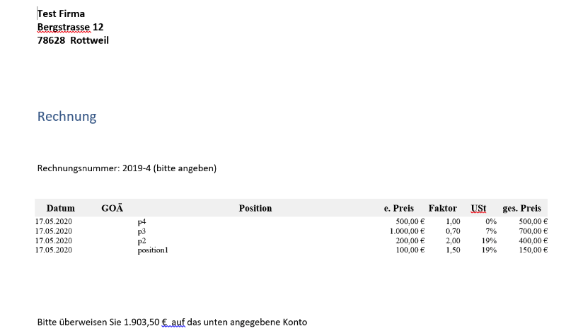 Sehr erfreulich, dass aber der Posten #Rechnung_MWS_Summe_netto# den Faktor berücksichtigt und den Gesamtnettobetrag korrekt berechnet.
