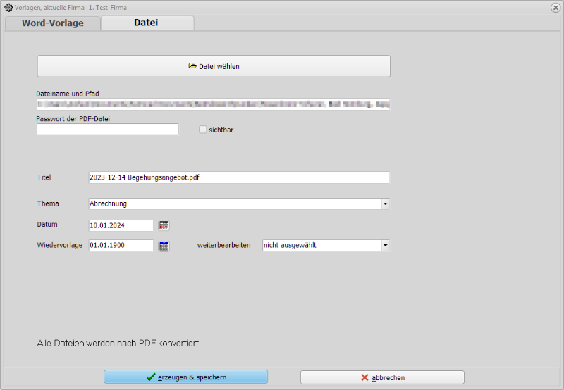 wenn man Dateien (PDF, DOCX, etc.) in die Firmen-Dokumente oder Probanden-Kartei importiert, dann kann man auf dem Formular im Rahmen des Importvorgangs gleich den gewünschten Dateititel und PDF-Passwort eingeben, aber nicht das Thema, Datum Wiedervorlage und Weiterbearbeiter.
