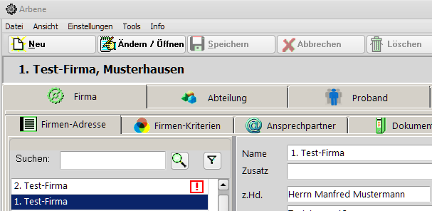In der Firmenliste erscheint ein farbiges Symbol, z.B. ein rotes Ausrufezeichen oder eine farbige Hinterlegung im Firmennamenfeld, wenn bei der Firma mindestens eine Rechnung existiert, die
