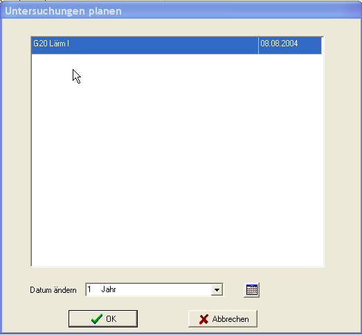 nein, gemeint hatte ich folgendes: Eine MFA hat in einem Betrieb Sehtests gemacht, sagen wir vor 2 Tagen, aufgrund interner Regelungen wird dort die Nachuntersuchung in 12 Monaten gewünscht. Ich möchte anregen, einen solchen Untersuchungstag zu wählen (z. B. aktuelles Datum minus 2 Tage) und auch die Nachuntersuchung für diese Sitzung zu wählen (12 Monate). Ich könnte mir das per checkbox vorstellen.