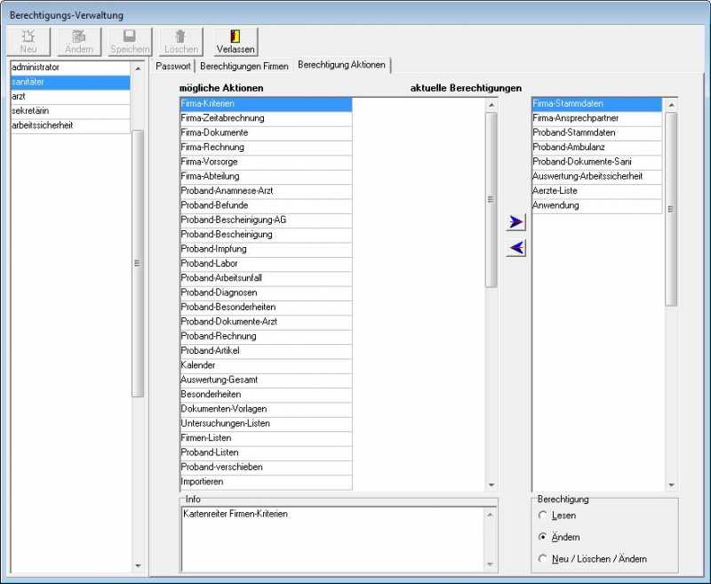 Noch etwas, das ich ziemlich verwirrend finde: In den beiden Feldern "mögliche Aktionen" und "aktuelle Berechtigungen" ist jeweils eine Zeile als ausgewählt angezeigt, also blau markiert. Dadurch ist nicht eindeutig, auf welche markierte Aktion sich die Angaben in den Feldern "Info" und "Berechtigung" gerade beziehen.