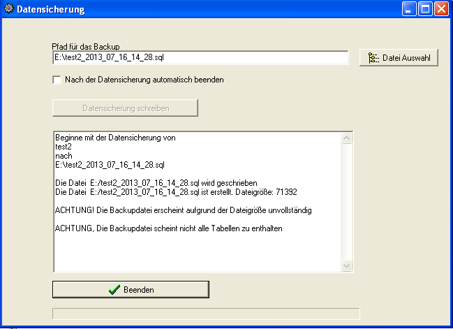 beim Backup beim Beenden von Arbene 3.0.0.17 erscheint nach Abschluss immer die Meldung "ACHTUNG! Die Backupdatei erscheint aufgrund der Dateigröße unvollständig