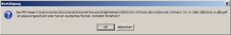 Beim Import von PDF-Dateien im PDF-Versionsformat 7.0, 8.0 und 9.0 kommt folgendes Fenster, danach wird die PDF-Datei dann ordnungsgemäß angezeigt.