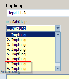 Trotzdem kommt in der Kartei bei Anlage/Ändern einer Impfung im Impfabfolge-Auswahlfeld die Impfreihenfolge reproduzierbar immer in der falschen Reihenfolge 1-2-3-4-5-6-7-9-8