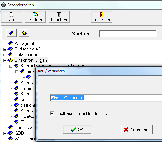 Leider ist diese Baumstruktur nicht mehr gegeben, wenn ich in der Kartei bei einer Bescheinigung unter Anmerkung Arbeitgeber oder Anmerkung Proband den Button Besonderheit einfügen aufrufe, hier erscheinen die Besonderheiten zur Beurteilung nur in einer unstrukturierten Liste unsortiert aufgereiht.