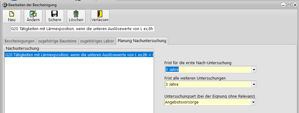 - Wenn als Folgeuntersuchung in den Voreinstellungen der Bescheinigung eine Frist von 0 Tagen eingestellt ist, (ggf. unter Einstellungen->Stammdaten->Fristen anlegen) wird der Dialog für die Nachuntersuchungen nicht automatisch angezeigt (falls dies unter Optionen so eingestellt ist).