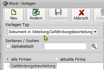 - Abteiung->Gefährdungsbeurteilung: Die formatierte Ausgabe der Gefährdungsbeurteilung ist wieder auf Arbeitsplatz-Ebene möglich. Die komplette Übersicht folgt. Die Vorlage muss hier eingetragen werden