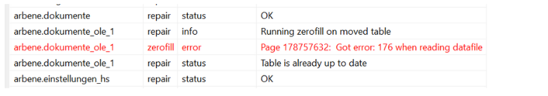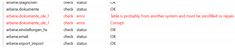 Die Datenbank habe ich mit Heidi SQL überprüfen lassen, wobei folgender Fehler angezeigt wird:
