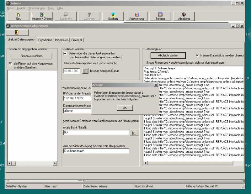 beim ersten großen Datenabgleich passiert bei mir folgendes: Das Satellitensystem schreibt die Daten in das Verzeichnis nach Z:\mysql\data. Das Hautsystem holt sich die Daten und schreibt seine Daten in das Verzeichnis. Danach holt sich das Satellitensystem die Daten. Die kopierten Daten werden im Abgleichverzeichnis gelöscht.