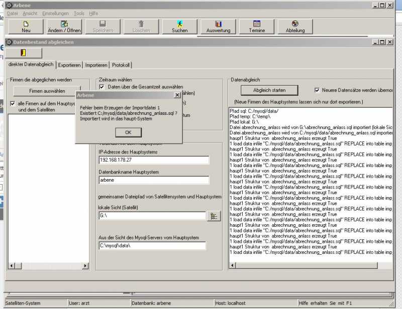 Wenn ich Sie richtig verstanden habe, führen Sie einen Datenabgleich über Tools > Satelliten > direkter Datenabgleich zwischen ihrem Satellitensystem und ihrem Hauptsystem durch. Dabei haben Sie im Hauptsystem unter Einstellungen > Optionen > Datenabgleich als Pfad aus Sicht des MYSQL-Servers (Hauptsystem) "C:\mysql\data" genommen.