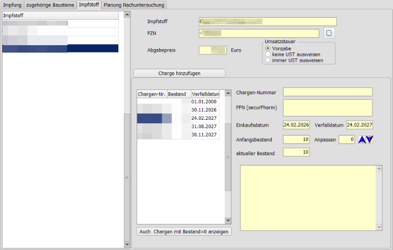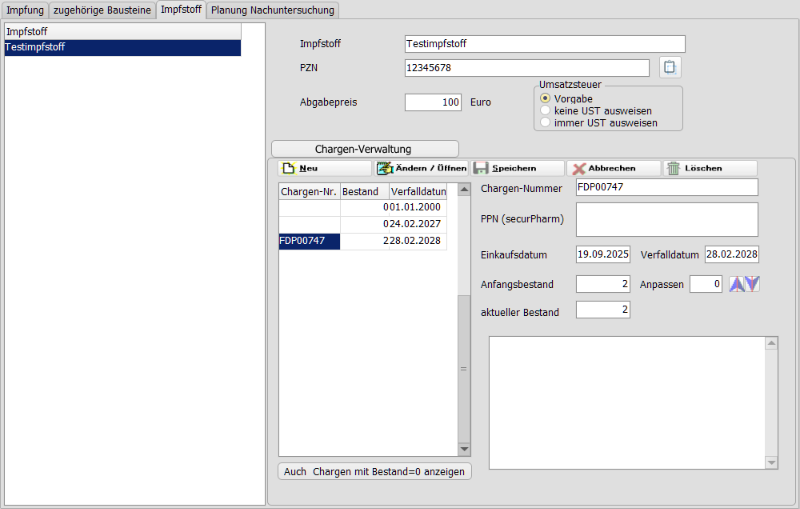 ich habe mal in Version 6.6.20 die Impfstoffverwaltung (Einstellungen -> Kartei -> Impfungen -> Impfstoff) getestet, da habe ich ein paar Verbesserungsvorschläge. Ich hoffe, du kannst prüfen, ob das umsetzbar ist.