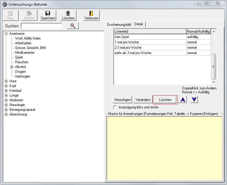 Bei einem Befund, der im Bereich Erscheinungsbild als Auswahliste und Anmerkungen definiert ist, funktioniert im Reiter Detail der Schaltknopf "Löschen" (siehe rote Markierung im Screenshot) nicht, d.h. einmal hinzugefügte Listenfeld-Zeilen lassen sich nicht mehr entfernen.