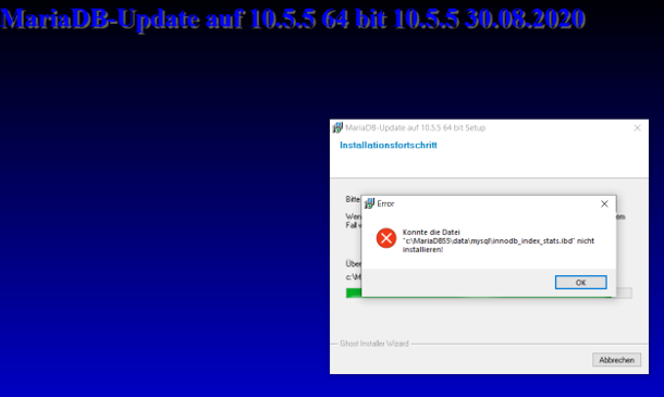 Ansonsten DB-herunterfahren und löschen sie alle Dateien wie ab manuelles Upgrade beschrieben - dann installieren Sie nochmals drüber - dabei kann nichts passieren.