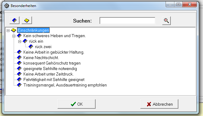 Leider ist diese Baumstruktur nicht mehr gegeben, wenn ich in der Kartei bei einer Bescheinigung unter Anmerkung Arbeitgeber oder Anmerkung Proband den Button Besonderheit einfügen aufrufe, hier erscheinen die Besonderheiten zur Beurteilung nur in einer unstrukturierten Liste unsortiert aufgereiht.